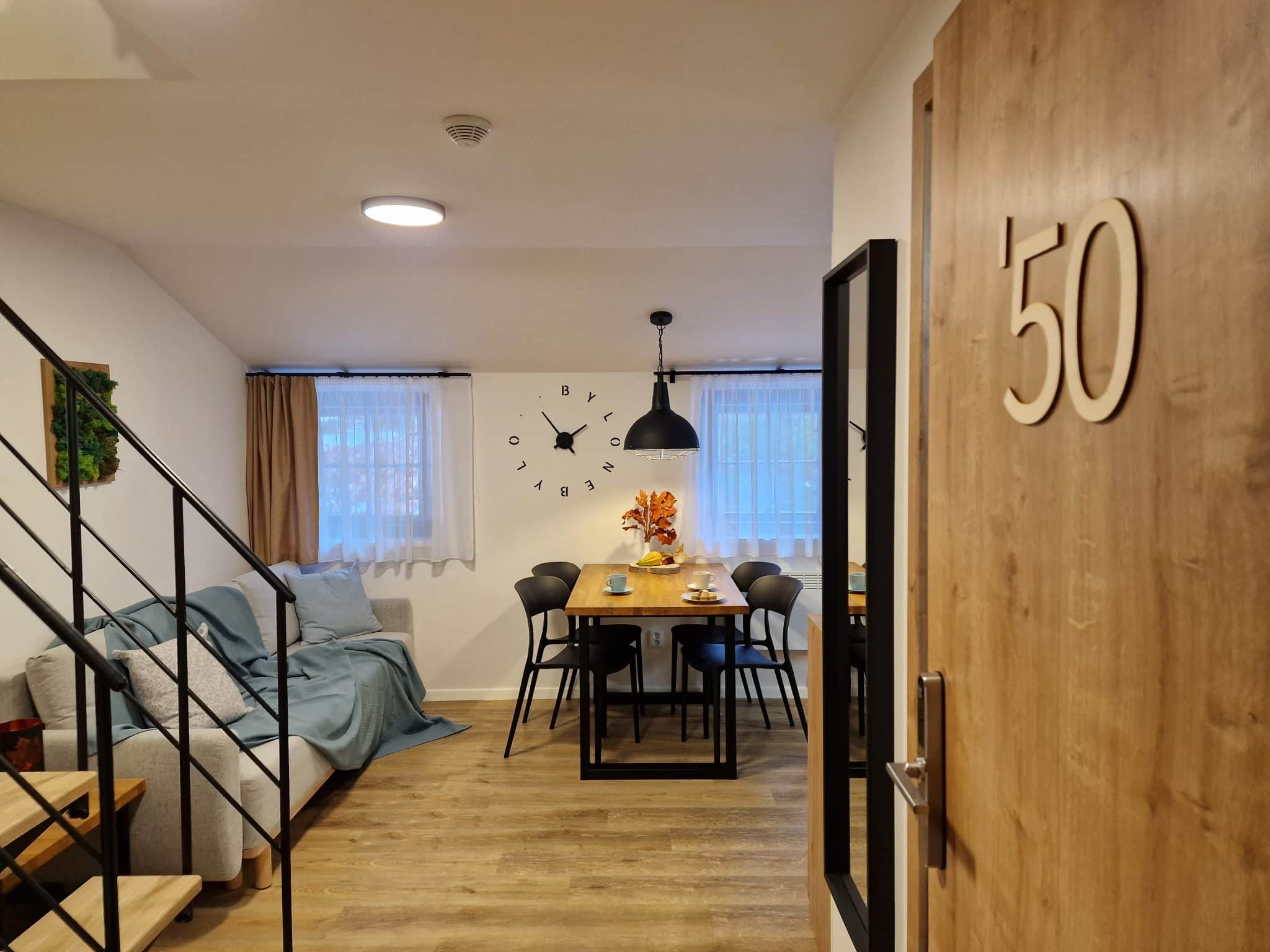 Mezonetový apartmán ´50 najdete v 2. patře. Je vhodný pro ubytování se staršími dětmi nebo pro skupiny přátel. Ložnice se nachází v patře a dostanete se do ní po vnitřním schodišti, právě to by mohlo menším dětem dělat problémy. V ceně ubytování je vstup do privátní sauny a dětské herny.