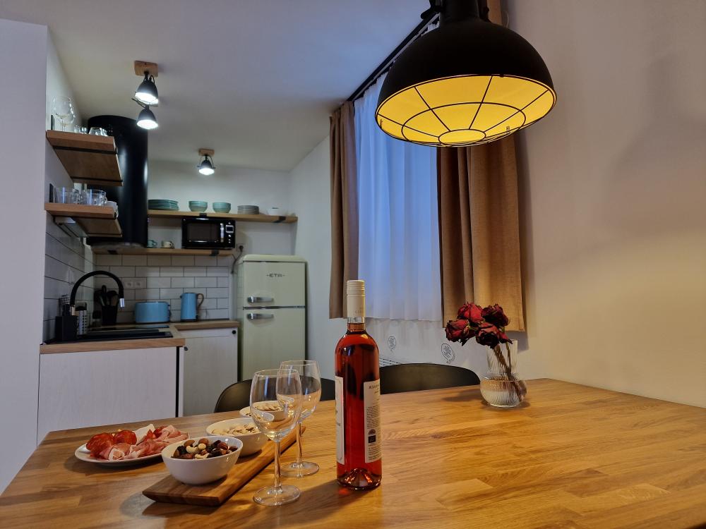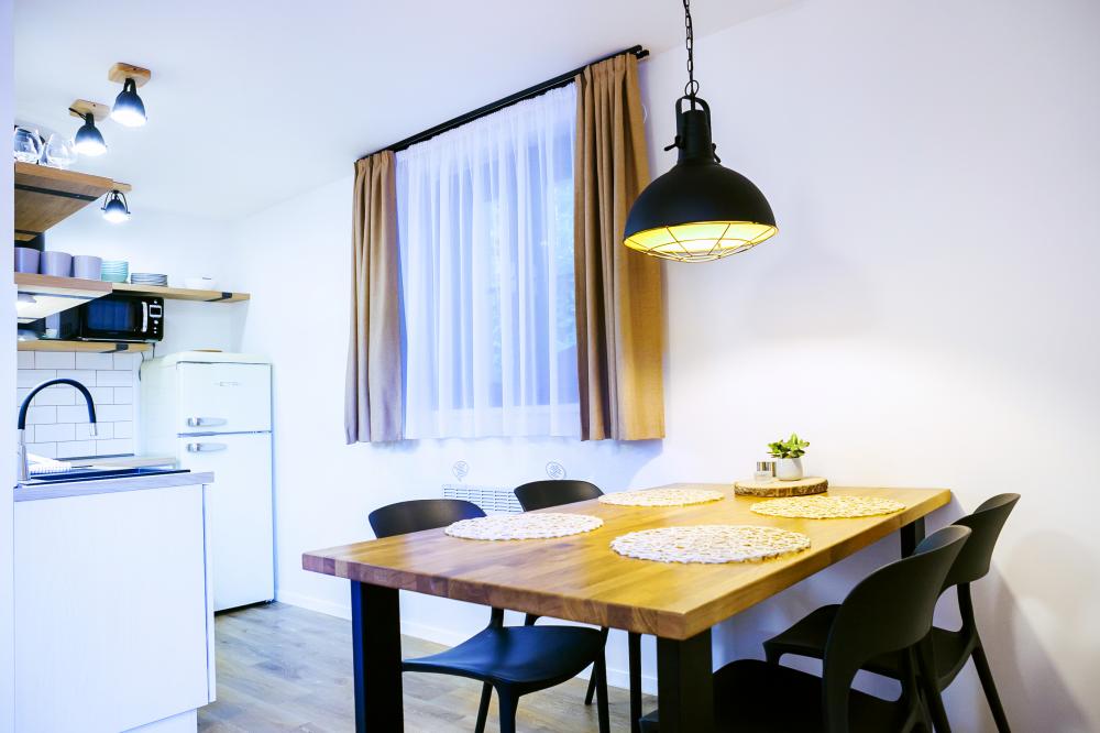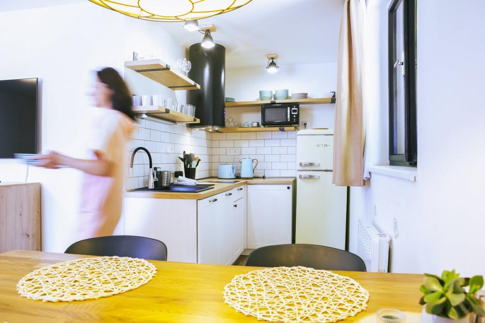 Plně vybavená kuchyň umožňuje vařit a cítit se u toho jako doma nebo na chalupě. Samozřejmostí je rychlovarná konvice, mikrovlnná trouba, myčka na nádobí nebo lednice s mrazákem pro uložení nakoupených potravin. V kuchyni najdete talíře, sklenice, hrnky, příbory i nádobí na vaření. Pro případ, že zapomenete na koření nebo jiné ingredience, je tu samoobslužný bar v 1. patře.
