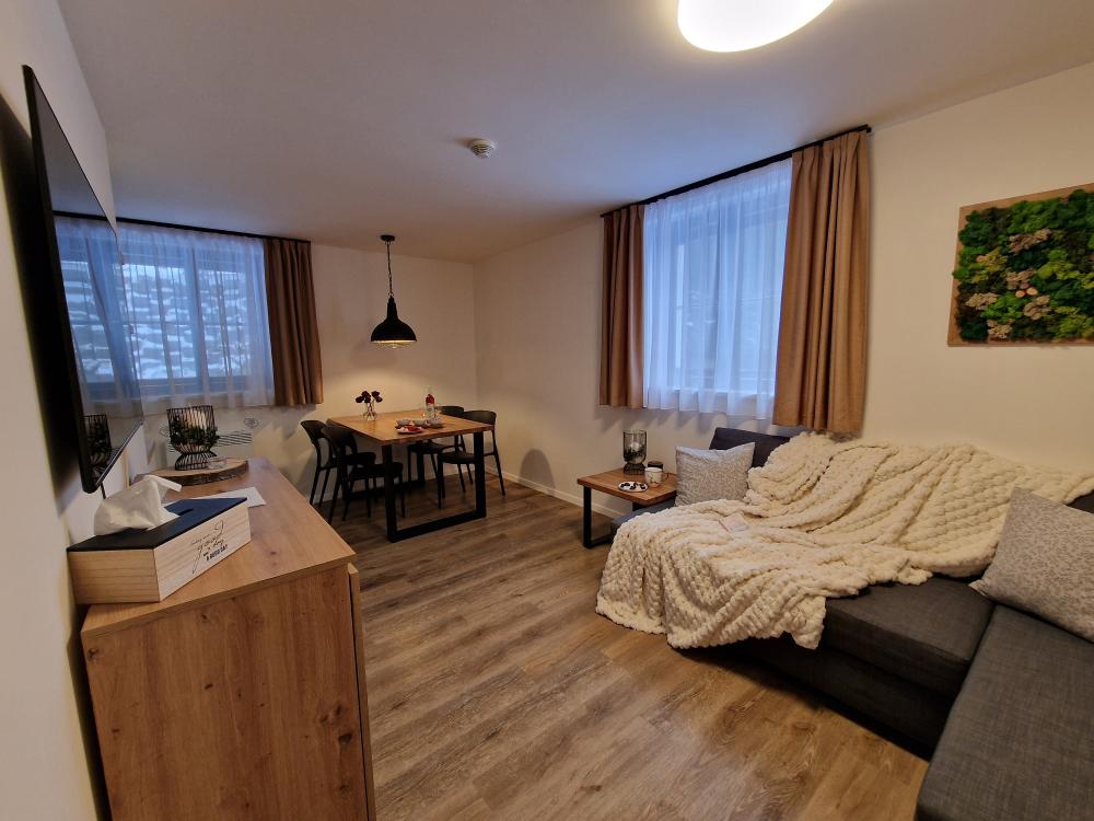 V moderním apartmánu najdete ložnici s kvalitními postelemi, pohodlný obývací pokoj a vybavenou kuchyň. Místnosti jsou oddělené dveřmi, děti tak mohou spát v ložnici a vy se můžete bavit v obývacím pokoji a nerušit je. Samozřejmostí je i koupelna se sprchovým koutem.