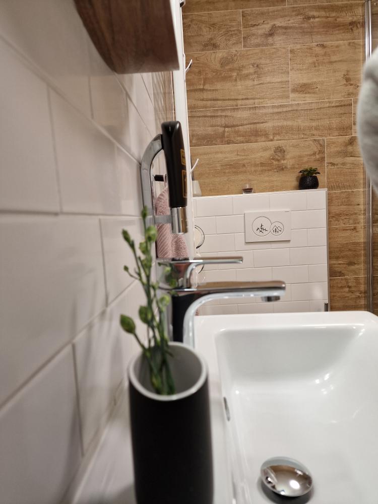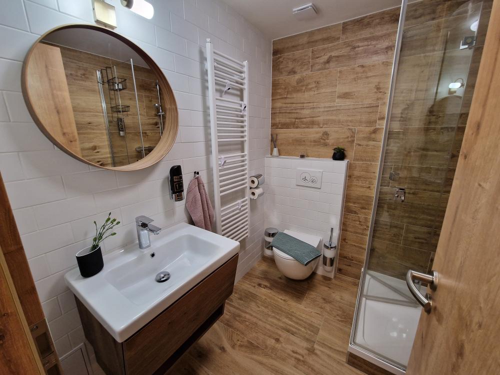 V koupelně se sprchovým koutem, záchodem a umyvadlem je připraven dostatek toaletního papíru pro celý pobyt, kvalitní mýdlo na ruce a šampon se sprchovým gelem. Kromě toho tu najdete i fén a ručníky.