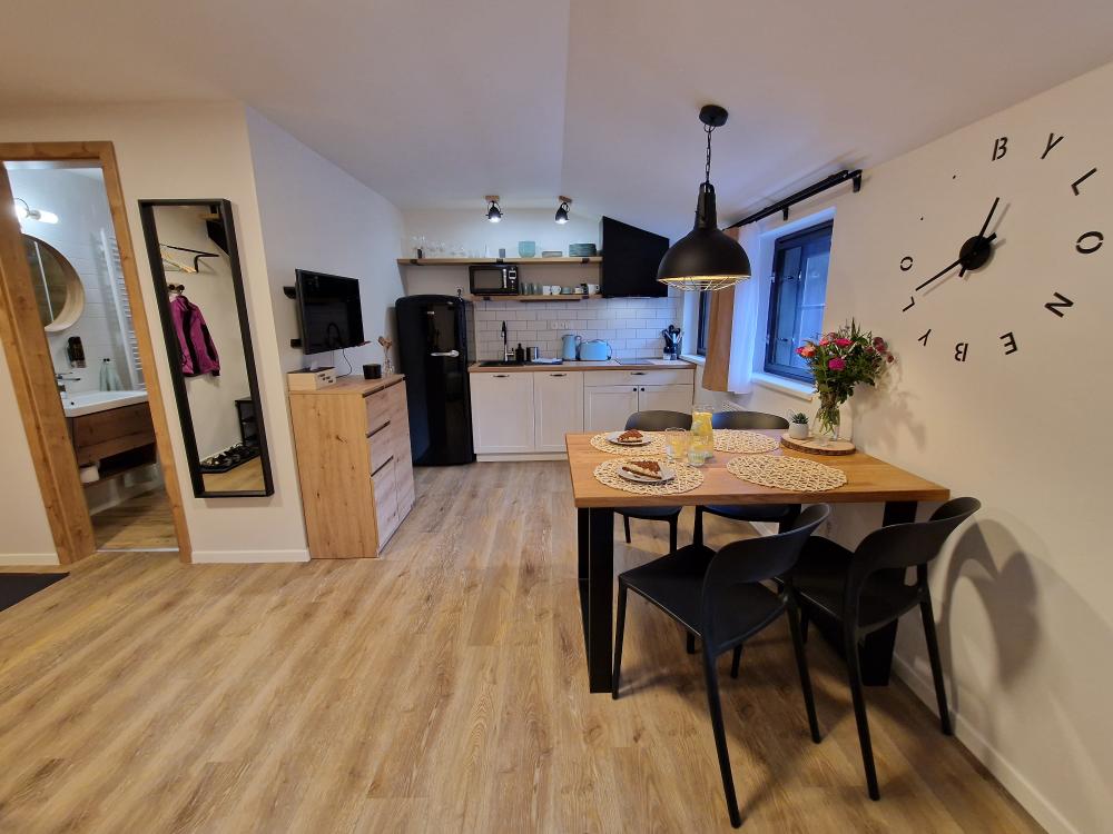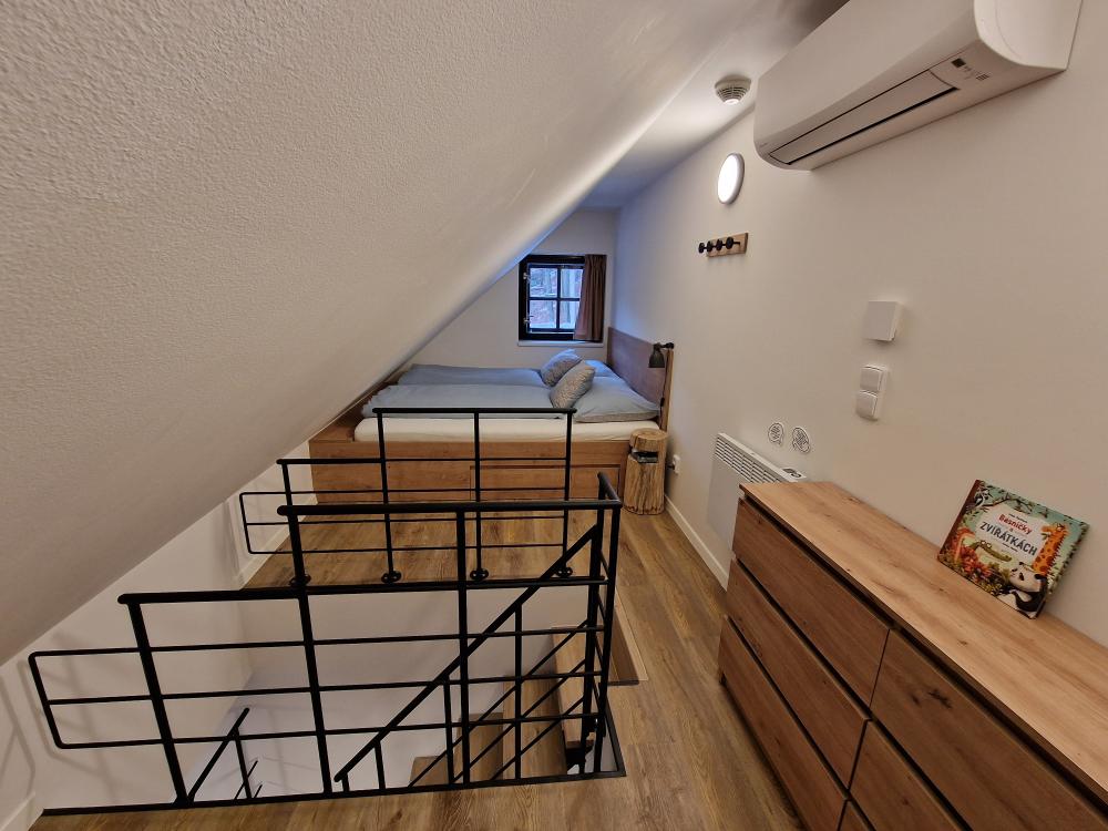 V mezonetovém apartmánu se ve spodním patře nachází vybavená kuchyň s pohodlným obývacím pokojem, kde můžete využít rozkládací gauč jako přistýlku pro 2 osoby. V horním patře najdete ložnici s kvalitními postelemi vyrobenými na míru. Samozřejmostí je i koupelna se sprchovým koutem.