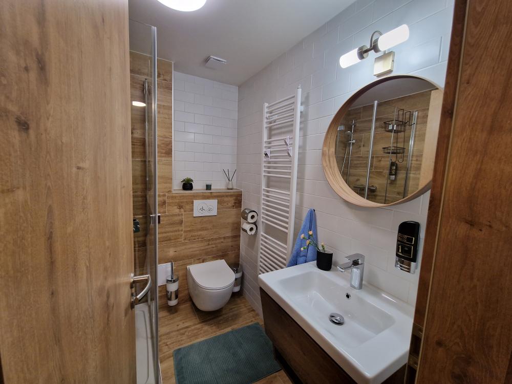 Koupelna se sprchovým koutem, záchodem a umyvadlem je vybavena dostatkem toaletního papíru na celý pobyt, kvalitním mýdlem na ruce a šamponem se sprchovým gelem. Kromě toho tu najdete i fén a ručníky.