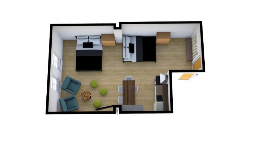Moderní studio je vybavené kuchyní i kvalitními postelemi. Vše je logicky rozmístěno v jednom pokoji o rozloze 44 m².